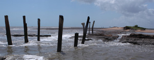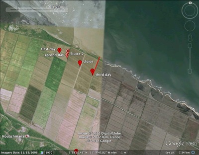 The rice fields at Mana, French Guiana. The points were the locations of our beach surveys. The red line represents .86 km in length, the distance lost to erosion since 2000.