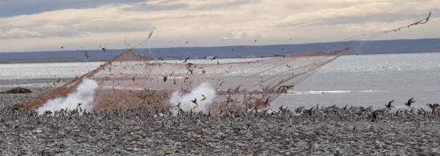 (Cannon net firing in 2007 over red knots at Bahia Azul with camouflage kelp in air.)