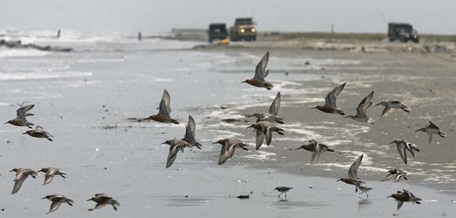 Pat Leary of Northeast Florida sent this picture of red knots on the coast of Lousiana. The picture was taken by photographer from the Times-Picayune showing one of the beaches oiled by the BP spill.