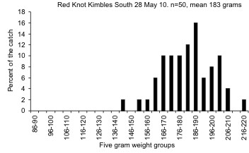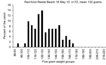 The stopover season slowly draws to an end. We made a catch Friday and the average weight compared favorably to conditions 13 years ago. In 1998, the average weight of our catch on May 28 climbed to over 185 grams, just two grams more than Friday’s average weight. These weights suggest the flock is ready to lift off as soon as the weather is favorable, perhaps Friday night or definitely by Saturday. See the histograms below comparing the distribution of red knot weights caught a five days after arrival on May 16, to red knots captured just before departure on May 28th. The other species appeared to arrive later in the season this year, but they too are catching up to their own Arctic flight weights.
