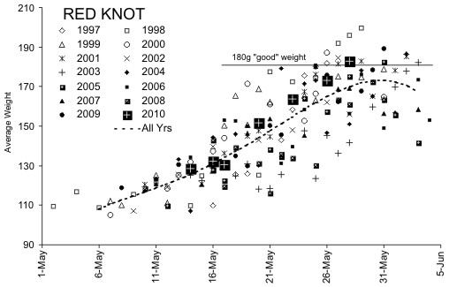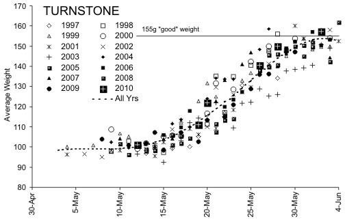 Red Knot Weight Summary for 1997 to 2010, 2010 symbol square with a crossRuddy Turnstone weight summary 1997-2010