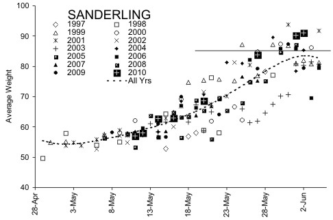 Sanderling weight Summary 1997-2010, 2010 symbol a square with a cross