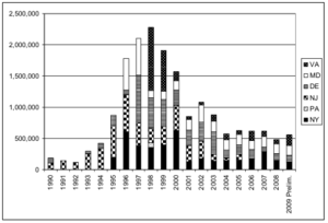 The second big question is what to do about the harvest of crabs. All of the crab surveys of the previous year point to no improvement in the number of crabs or the density of eggs. The reasons are at first obvious, the crab harvest has remained unchanged despite a moratorium in NJ and severe reductions in harvest in DE. Why? Because more crabs were taken by adjacent states.