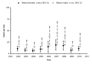 The number of mature horseshoe crabs in a survey trawl done by Virginia Tech. The graphs is sanctioned by the Atlantic States Marine Fish Commission and shows no improvement over the last 6 years.