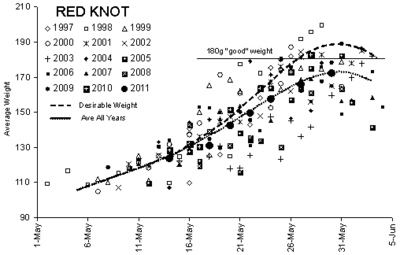 The average weight of red knots caught in NJ.(1997 to 2011). The dotted curve describes the average of all catches the dashed line is an estimate of weight increase necessary for birds to reach 180g by late May. Average weights stayed well below the 180 g threshold in 2011