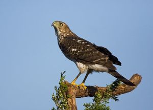 Coopers Hawk, Photo by Kevin CarlsonThis land calls to all of these birds but especially those in need.  In the afternoon, when the migration has petered out to a few stranglers, kestrels dot the phone wires looking for the movement of migrating dragonflies in the fertile grasslands, sharp-shinned and Cooper’s hawks look for migrant songbirds as they dart through the woods like phantoms, appearing and disappearing in a second. Eagles preside over the tidal waterways looking as though they haven’t a care in the world, while harriers fly constantly over the marshes hoping to surprise an unwary bird or mammal.  You can’t sit and watch passing raptors in the woods and field of Greenwich, better to go to Cape May for that.  This is a place where one can watch a raptor make a living,  a Cooper’s hawk darting through a wooded hedge row, bearing down on a hapless sparrow or blackbird, or two eagles in a territorial dispute or winging silently down to the water to scoop up a fish reckless enough to swim near the surface.
