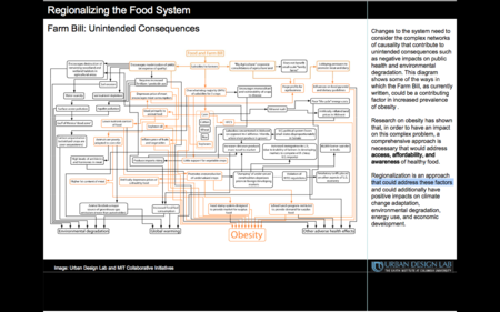 But a potent political force needs direction, which is the third reason why we have destructive forces afoot in our rural lands — our nation’s policies promote it. Perhaps the best example of this is our farm policy. Attached is a nearly impenetrable flow chart of the destructive forces created by the current Farm Bill published in a project created by the Urban Design Lab of Columbia and the MIT Collaborative Initiative. By subsidizing just five crops we have unleashed huge industries that take away farms from families, encourage the transport of vegetables from foreign lands, create an obesity epidemic that is the primary reason for our overburdened health care system, degrade our agricultural lands with chemicals and overuse, and have pressed into service natural lands that are not suited to good agriculture. ![]()