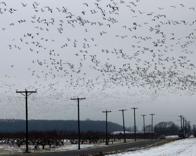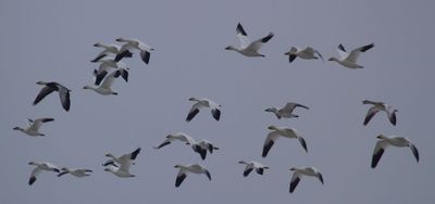 Part of the reason is the skill necessary to kill Snows.  It is a tricky operation that sometimes requires hundreds of decoys to bring the birds into a field.  Another is the inefficiency of the hunt.  Here in Greenwich, NJ, one can hear a few, distant shotgun blasts in the early morning light followed by the raucous explosion of thousands of geese lifting off to another field — which is very likely unhunted. One has to question if a shorter, more organized season might be better if only because more hunters would be shooting the same flocks at the same time.