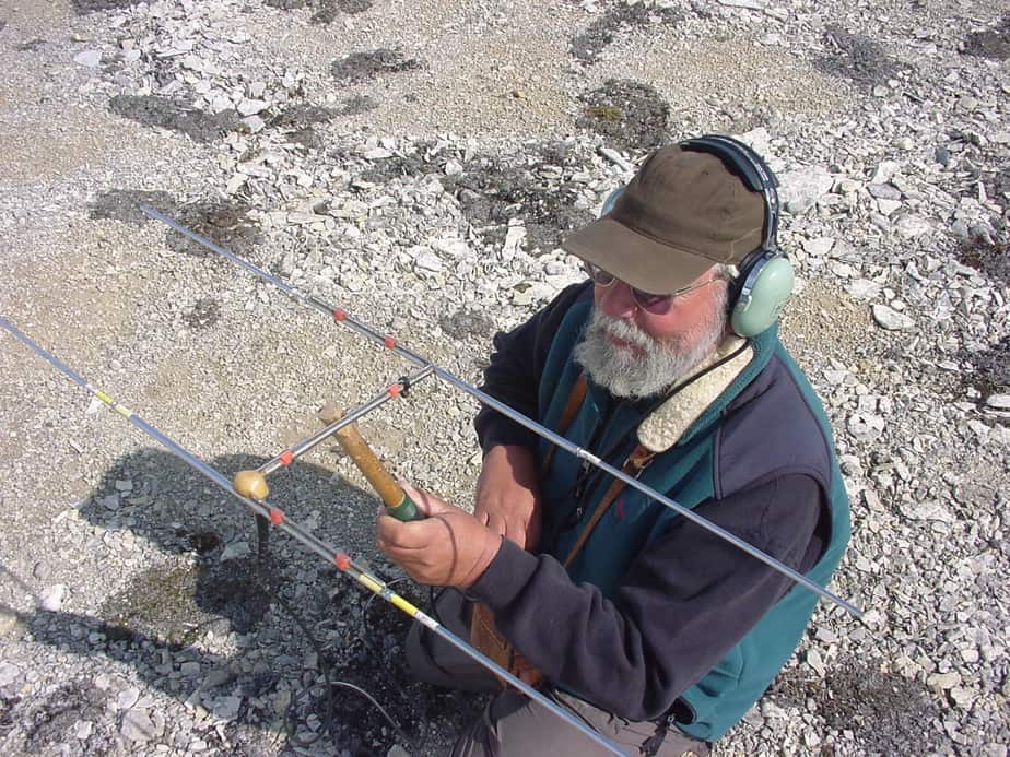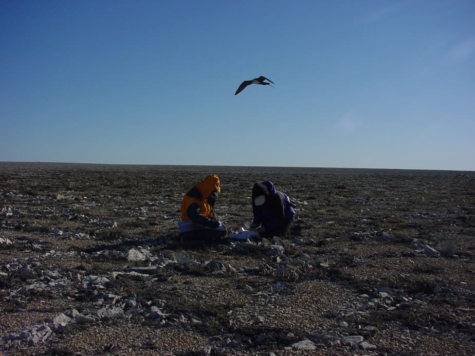 Meanwhile, Mandy and Nancy spent several days following the other brood. Hugging a lakeshore of mudboil and small wetlands, the adult and her brood of four chicks picked insects in an area the size of a small suburban lot. At one point a long-tailed jaeger showed interest, landing within 50 meters of the hapless chicks. They froze, their black and white down making them nearly invisible in the dryas and rock. Perhaps without us in the area, the jaeger would have taken the birds. Instead, he lifted into the stiff arctic breeze and flew off to find food elsewhere. The following day, Mandy, Steve, and Johnny followed the family 1.2 km across the lakeshore only to return to the original location by the end of the day.