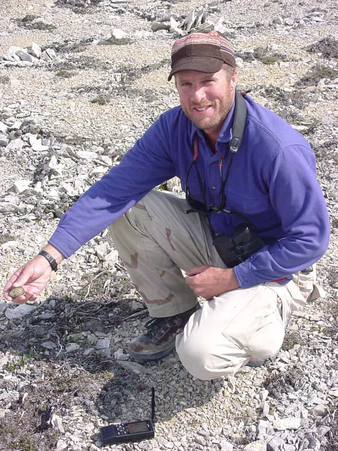 Our fourth bear finally arose about 1:00 p.m. Stretching and yawning, he lumbered slowly into the water and swam off to the northwest. He moved out of sight within an hour. After our close call of the previous day, the bear coming within 100m of camp, we decided to step up our precautionary efforts. We now share in all-night watches, and during the day, we split into groups equal to the number of guns we pack. We realized we must take it seriously. Johnny told us he rarely sees more than 3 or 4 bears in a year of wandering about the island and its icy waters. Slowly, we pick up new broods or nests. Brad and Mark found a nest close to our camp, of the pair that has puzzled us for at least the last week. A lone egg filled the nest cup indicating either predation or hatching. An intensive search by Johnny and Bruno turned up no new broods in the lake and wetlands closest to the nest. We did locate two new broods in the wetlands east of our camp. After an intensive search of wetlands, Bruno and Mark found two broods in a large wetland east of camp. We captured one adult with 3 chicks and instrumented the adult with a new transmitter. We now have three broods to follow. I stayed with the family until they roosted at 8:00 p.m.