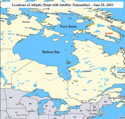 Yesterday we flew from Ottawa to Iqaluit, the Capitol of the Inuit territory of Nunavut. The people and the scenery here have been great. Iqaluit has served as the staging point for much of our work so far and shortly after arriving, we met with the pilots to discuss the route we hope to fly over the next few days. Our initial flight plan was based largely on the maps of potential red knot habitat produced by the Rutgers CRSSA lab and data collected by Paul, and members of CWS, on brant habitat in the area. Paul was able to fly in many of the same areas in 2002 and therefore has some idea of key brant areas around the Foxe Basin; most of these areas nicely overlap with potential red knot habitats. This year, our flight plan has been further informed by data from 10 brant carrying satellite transmitters. As recently as this morning, we received an email detailing the location of these 10 brant as of June 28th (see map). This has resulted in some slight modifications of our flight plan to ensure we fly over the areas where these “satellite” brant were located.