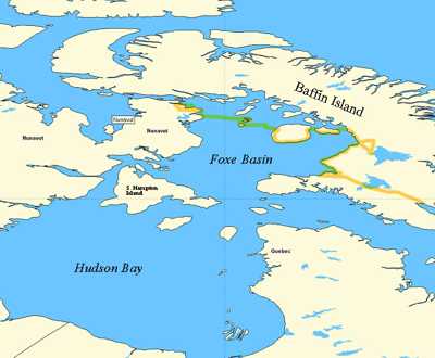 The second leg of our flight took us over the south sides of Airforce and Prince Charles Islands and allowed us to completely survey the Spicer Islands. We landed in Igloolik at 5:30 AM on July 1, 2003 having covered 1,167 miles on our first day (or night as it were) of flying (see map). We stayed in the town’s co-op that morning, resting soundly for our next bout of flying. In the end, no red knots were located during this first trip and a total of 4 brant were located along the Great Plain of the Koukdjuak. Our plan was to get up in the early afternoon and continue surveying the northern part of the Foxe Basin.
