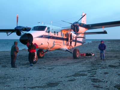 In order to make it across the Foxe Basin with sufficient fuel we made a planned landing on a very short landing strip on Nikku Island. This particular landing strip is surrounded by water on three sides and is less than 1,000 feet long. As we approached, it seemed as though there would be no way for the pilots to land a plane as big as the one we were in on a landing strip as short as the one below us. Twin Otter airplanes are design for exactly this type of work, however, and our pilots safely brought the plane down with ease (see image 2). After loading the six 55-gallon drums of fuel that we had taken with us into the plane and catching a quick snack, we set off again to continue surveying.