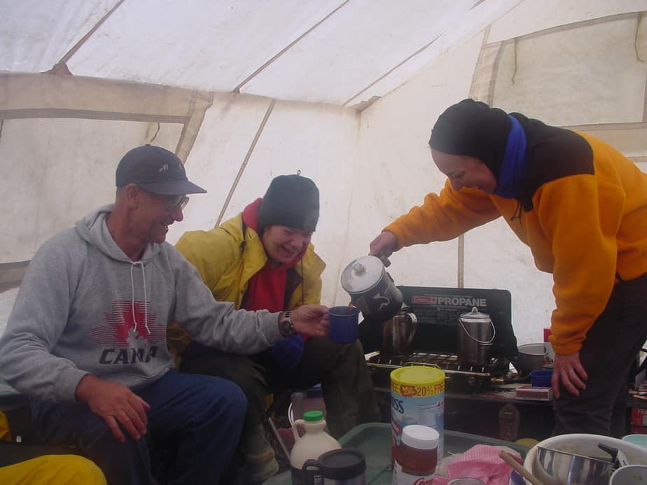 Nancy "Olive" our camp cook serves Bruno and Liz.