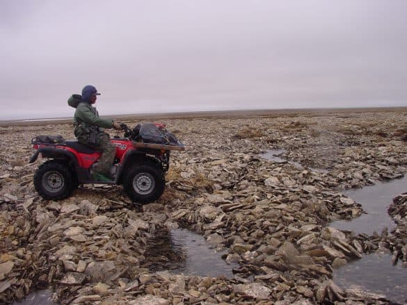 Johnny Alogut and Larry Niles traveled over 20 km to Cape Low where we found our only instrumented bird. The trip by ATV took about 4 hours through mostly barren tundra laced with a myriad small rivers, wetlands and lakes. We searched the area for a few hours, but the bird was no longer there. This is actually good news because we know the transmitter is still attached. We will search for it when we continue our aerial search tomorrow. While traveling we saw over 50 caribou, 2 snowy owls and 5 pairs of long-tailed jaegers.
