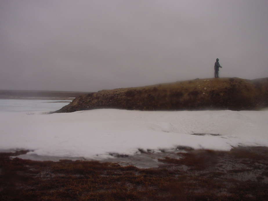 Graciela sits at one of our new nests. By the evening of the third we had found three new knot nests putting our total up to five nests. We've reached a critical point because now it's feasible for us to devote some time to nest habitat and behavior studies. Tomorrow Mark, Graciela and Nancy will attach transmitters to one of the adults on each of the five nests. This will allow us to begin several small studies, one to determine the incubation period, another to study the habitat of the non-incubating adult.