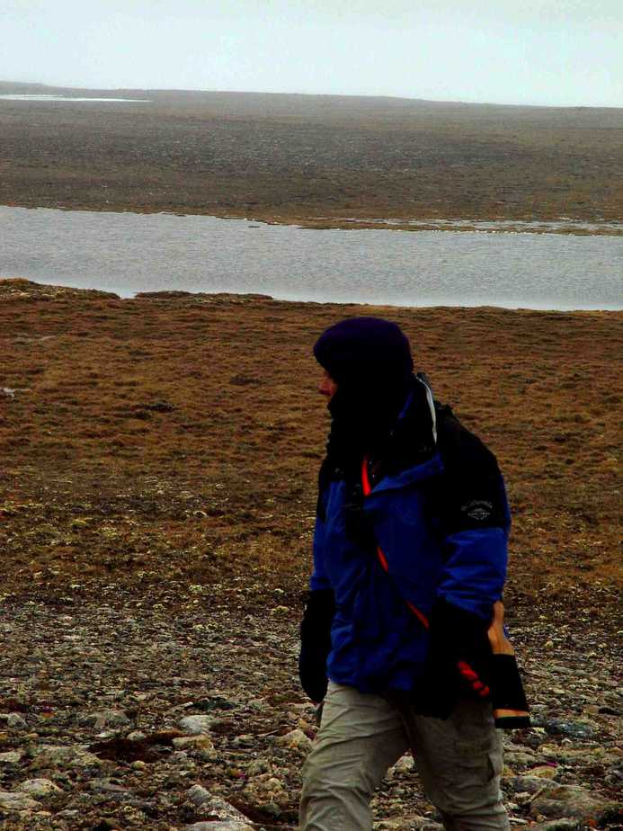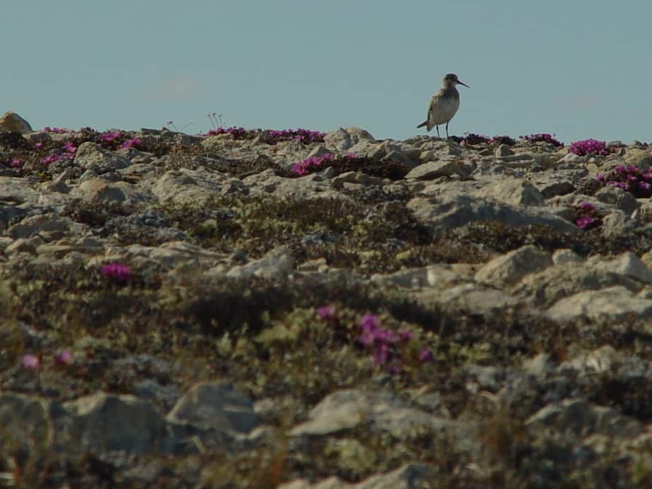 As usual, the red knot would take more work. Humphrey, Mark and I took the first trip north to reconnoiter suitable sites closer than those northern areas that were indicated on the maps. We followed the trail, which was continuously marked with inuksuits, or stacked stone markers frequently used as symbols of Inuit culture. Inuksuits are guideposts that mark trails in the extreme cold, snow, and wind of an Arctic winter. Dryas, sedge, heath, lichen, and saxifrage dominated the upland landscape in much greater density than what we knew as suitable to knots. We focused on the 1-3 km patches of nearly barren land (less than 10% cover) similar to the knot habitat of Southampton Island. After much overland searching, we found knots calling at two sites and decided to bring in the entire team to search for nests the following day.