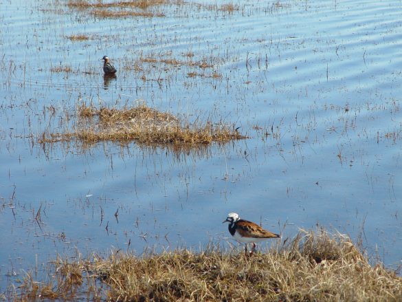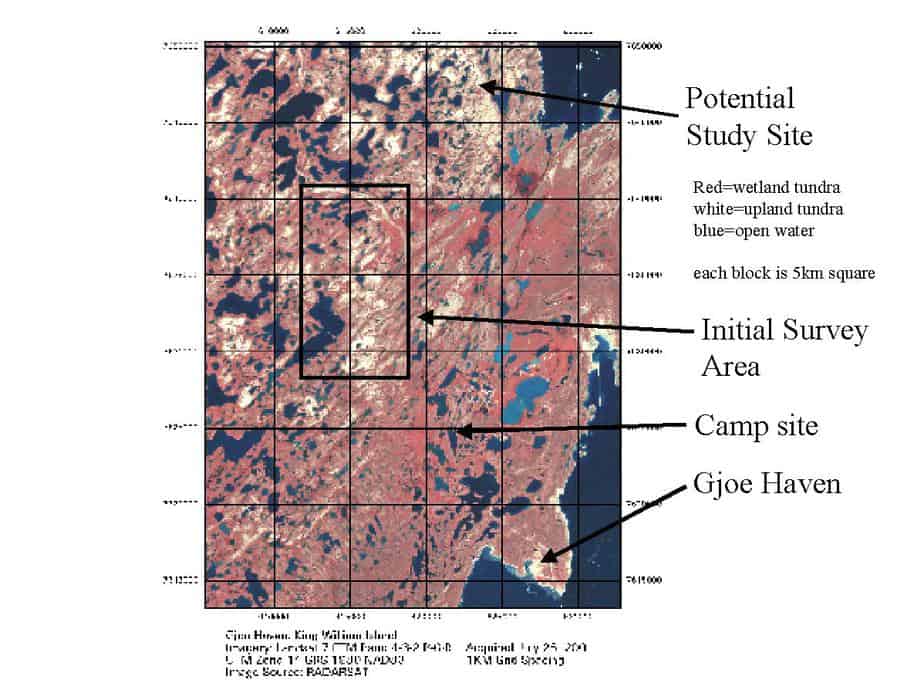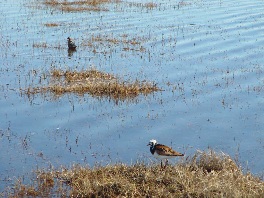 (Using maps with Rick Lathrop’s satellite mapping), Pete, Mark, and I designated all the places similar to the area we heard knots that day. Pete downloaded waypoints on each of our GPS units to help locate them in the field. The next day, we divided into three teams, each surveying 8 sites using a protocol developed on Southampton Island, which included 20 minutes of recording all birds seen and heard. The sun shone warmer and brighter than at anytime in our entire trip. Mandy, Bruce and I took the area farthest north, which included an esker as long as that in Southampton Island but about twice as high. Nancy, Mark and Rodger’s area included the site where we had found birds the previous day. Our hopes ran high.