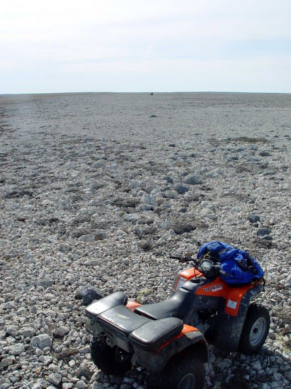 The trip into the coastal areas north of Gjoa Haven would be an all-day rough ride of over 60 km, much of it without the benefit of a trail. We had little choice though, as the main goal of our work on King William was to establish a new study site that would provide a more extensive area of habitat than on Southampton Island and more economic logistics. The north shore held great promise in this regard. We could access it with ATV’s and establish one base camp from which we could study knots in an area at least five times as large as that in Southampton Island. Between the two sites, we would have a reasonable method of determining breeding status of the red knots coming through the Delaware Bay.