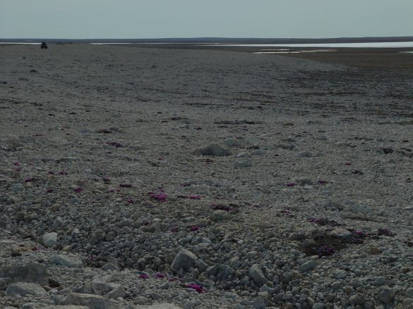 Early the next morning, our third day at base camp, we intended to sweep the most promising areas found the day before. Although we intuited the habitat as marginal, and our preliminary survey of potential habitats in an area of approximately 100 sq. km substantiated that, we intended to test it by sweeping the most promising areas. We employed the method developed at Southampton Island using 50ft ropes with 2 ft plastic strips every 7 ft carried between 9 people. Our search would be more difficult as the areas suitable for nesting were scattered amongst more vegetated habitats. We found no nests that day, although we had located one pair we presumed to be nesting. Altogether, the area appeared unpromising as a new study site. We resolved to go as far north as we could the next day.