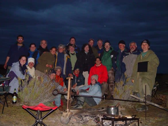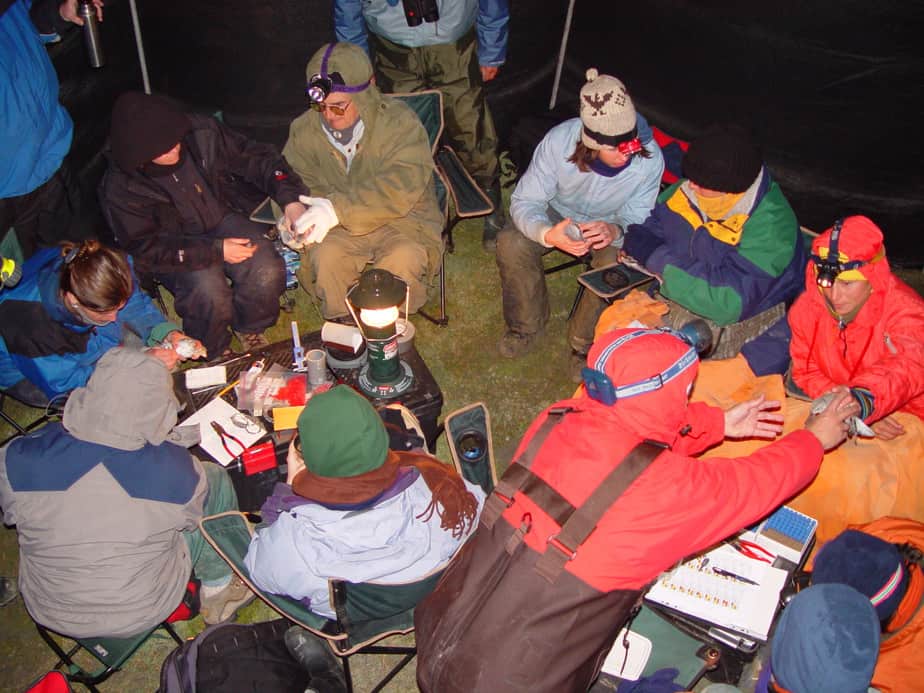 That evening, under a virtually windless steel-gray sky Ricardo prepared a Cordero assado or lamb barbecue. While we ate a feast of lamb, potatoes, torta frita (fried bread), vegetables and rice, flocks of shorebirds darkened the sky along the bayshore behind camp. We were heartened by the thousands of red knots settling into the area of our nets. We were discouraged by the peregrine falcon and the several foxes also in the area. High tide on the bayshore has brought all of us to prey on the birds.