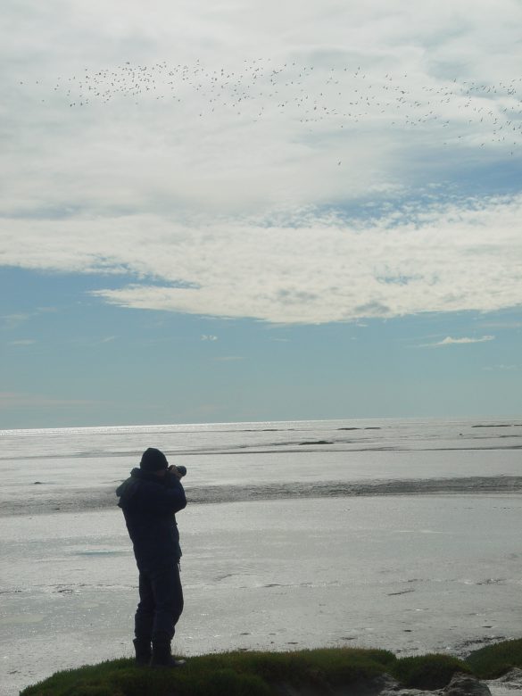 By 10:00 the next morning, the full team left camp for a fresh reconnaissance of bird distribution along the bay. Each day we could see smokes of birds from our camp, but to our chagrin they were gone. Eventually we located a large flock of godwits about 5 km south of camp roosting on islands of salicornia isolated by the flooding tide. The knots seemed to have disappeared from the western bayshore.