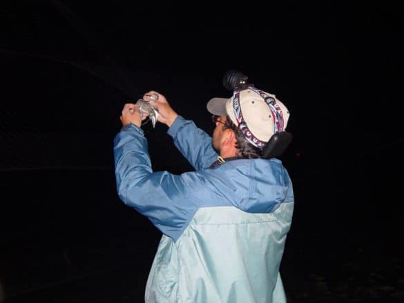 The rest of the team focused on trapping knots. Without high spring tides we stuck to our mist nets which were set on two peninsulas of salicornia jutting into mudflat that was flooded only on the spring tide. Fortunately the tides were reaching their new moon high (9.45 m), flooding all the flats and pushing the roosting birds from the flats onto the salicornia. Even at night, birds will roost for only a short period in the higher vegetated marsh because of the increased danger of predation. The introduced gray fox has adapted well to the shores of Bahia Lomas combing the shoreline nightly for any weaken prey.