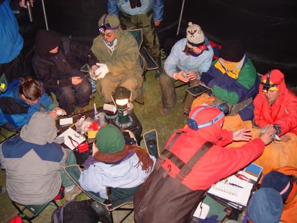 We began our first mist net session on Saturday, although the high tide flooded early and we only had one hour of suitable tide. We made a modest catch of 27 birds (17 knots, 1 godwit, 1 white-rumped sandpiper, 5 two-banded plover, 2 South American terns, 1 kelp gull, 1 Magellanic oyster catchers). We were done by 1:00 a.m. with a chilly wind from the west and a sky so clear you could see dense stars down to the horizon.