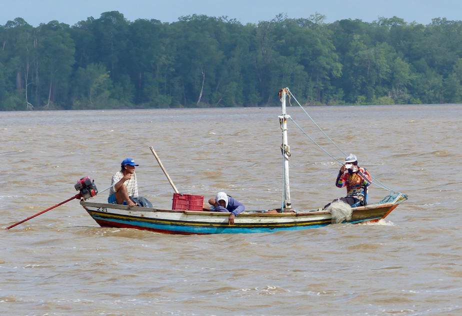Then he took the boat in a channel so narrow, the crew had to duck the whipsaw of mangrove branches. We slowly snaked our way through a tunnel of green until we reached another wide channel. Within a few minutes, we entered another narrow channel ultimately reaching the next bay. Here we felt the full force of the stiff winds and deep rolling swell of the Atlantic. An hour later we weighed anchor at the small community of Apiu Salvadore.