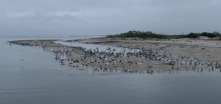 Laughing Gulls, Red Knots, Ruddy Turnstones, Sanderlings, and Semipalmated Sandpipers struggle to find horseshoe crab eggs on the shoals of South Reeds Creek. Eggs are scarce because cool water temperatures prevent crab spawning.