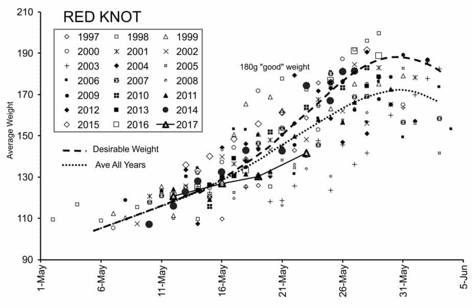 The graph plots all the average weights of all the catches of the red knot our team has made since 1997. The average weight of our catch on May 23 suggests trouble is brewing for these birds.