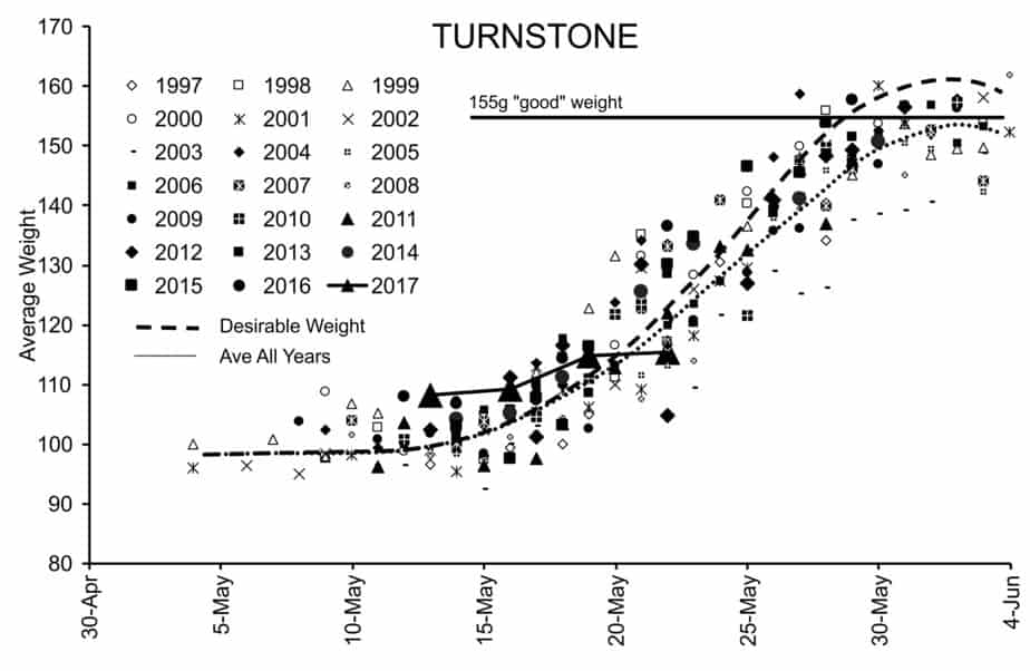 The graph plots all the average weights of all the catches of ruddy turnstones our team has made since 1997. The average weight of our catch on May 22 suggests trouble for both species.