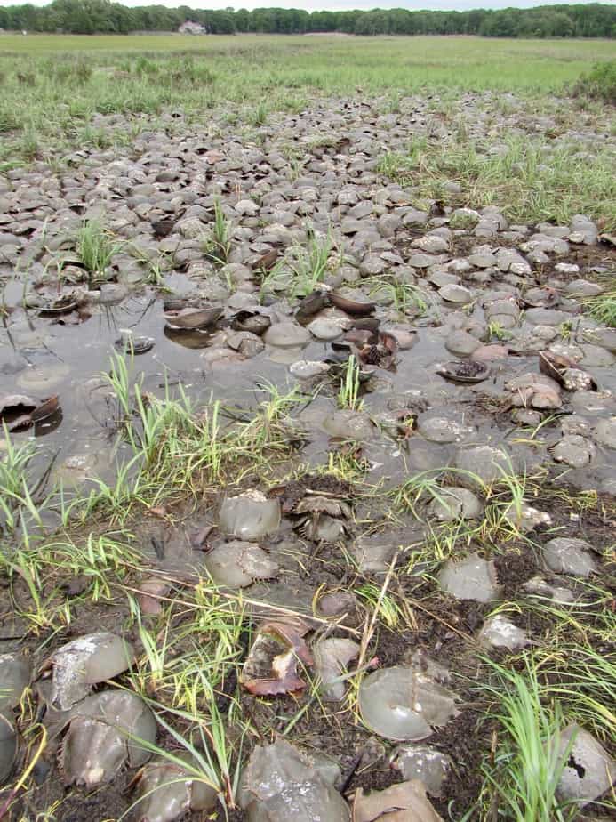 Thousands of horseshoe crab died because of a combination of a spring new moon tide, and easterly wind lifting waters to rarely seen high tide levels. Unfortunately for breeding horseshoe crabs, the benign easterlies suddenly shifted from the west, pushing water into breaking waves that lifted crabs over the upper beach berm and into the back marsh. With no escape, most died of slow affixation. Fortunately many volunteers of the Return a Favor Coalition braved difficult conditions to rescue many thousands of crabs. The coalition includes Wetlands Inst., Bayshore Discovery, American Littoral Society, Delaware River Keepers, Citizens United, and others. .