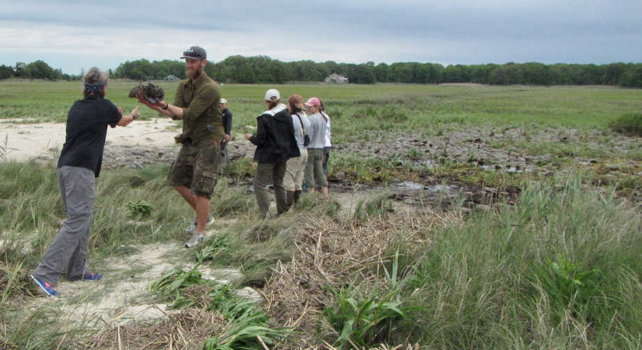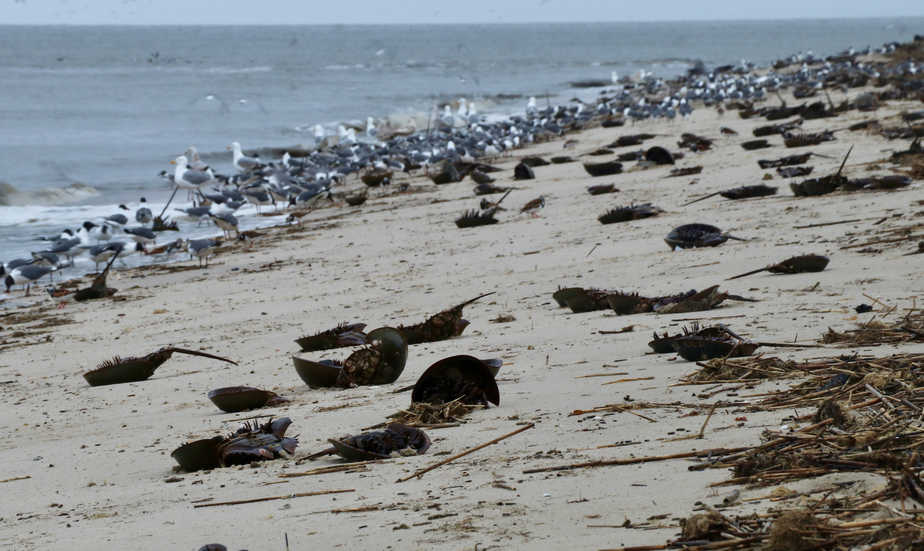 Horseshoe crabs naturally die in the process of spawning because the bay’s wind-driven waves upend them, leaving the stranded upside down on the low tide beach. Gulls attack them eating their gills and the eggs still lining the shell of the females. Most die before the next high tide can rescue them. The ReTurn a Favor Coalition of Bay conservation group fields teams to right them, saving 75,000 last year and very likely more this year.