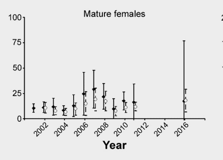This graph from a report on the status of crabs done by Eric Hallerman and David Hata of Virginia Tech show the lack of any signs of recovery in the female horseshoe crab population of Delaware Bay since 2001