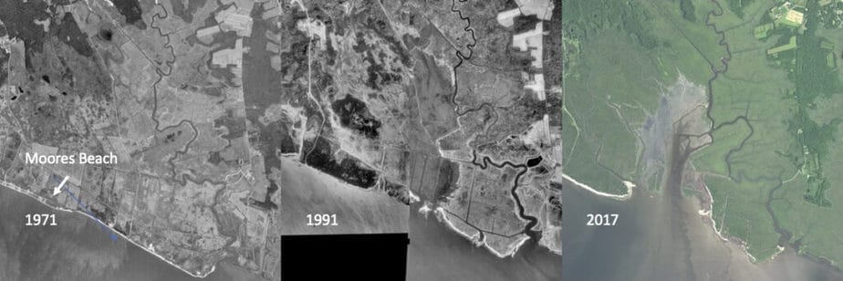 Three aerial photos taken in 1971, 1991, and 2017 show the relatively rapid destruction of beach and marsh at Cox Meadow on Delaware Bay caused by the abandonment of salt hay farm dikes without any response.