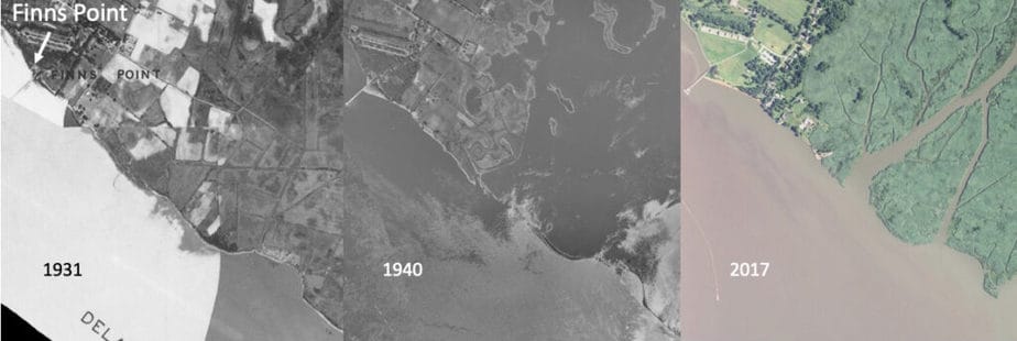 Breakwaters are old technology but tried and true. For example, in the early 1900s, as in most of the bay, farmers built dikes to keep out the tide so they could farm the marsh along the upper bay shoreline around Elsinboro at a historic site called Finn’s point. In the first graphic below, you can see these dikes in a 1931 aerial photo of the area. Finns Point is just visible at the upper right corner. In the middle aerial photo taken in 1940, you can see two important features. First, the farmers abandoned the diked fields, and the tide overwhelmed the site and threatened the inland communities. In response, the community built stone breakwaters to replace the farmer’s earthen dikes. You can see the result in last image of the series from a 2017 aerial – the breakwaters remain, and the protection allowed the marsh to recover.