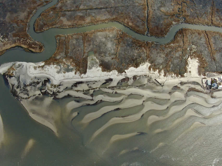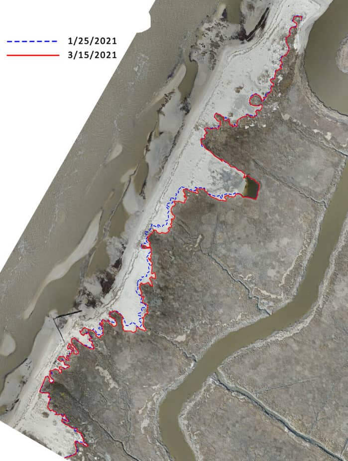 One reason for the loss comes from the ever-increasing threat of Climate Change. Winter storms have grown in frequency and severity, and as the bay warms, winter ice that usually forms along the shoreline has all but disappeared.. The impact is dramatic. Without floating ice moderating waves or ice chunks taking the brunt of storms, the beaches struggle to hold sand from being pushed into the marsh behind. The first map below compares drone shots taken in late Jan and mid-March. In just two winter months, the shoreline moved inland significantly.