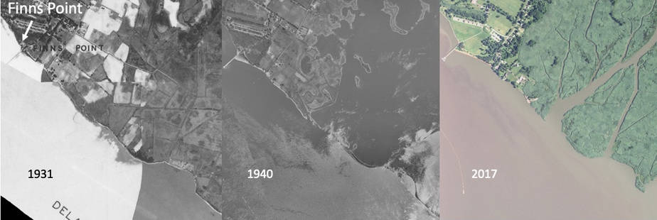 Breakwaters are old technology but tried and true. For example, in the early 1900s, as in most of the bay, farmers built dikes to keep out the tide so they could farm the marsh along the upper bay shoreline around Elsinboro at a historic site called Finn’s point. In the first graphic below, you can see these dikes in a 1931 aerial photo of the area. Finns Point is just visible at the upper right corner. In the middle aerial photo taken in 1940, you can see two important features. First, the farmers abandoned the diked fields, and the tide overwhelmed the site and threatened the inland communities. In response, the community built stone breakwaters to replace the farmer’s earthen dikes. You can see the result in last image of the series from a 2017 aerial – the breakwaters remain, and the protection allowed the marsh to recover.
