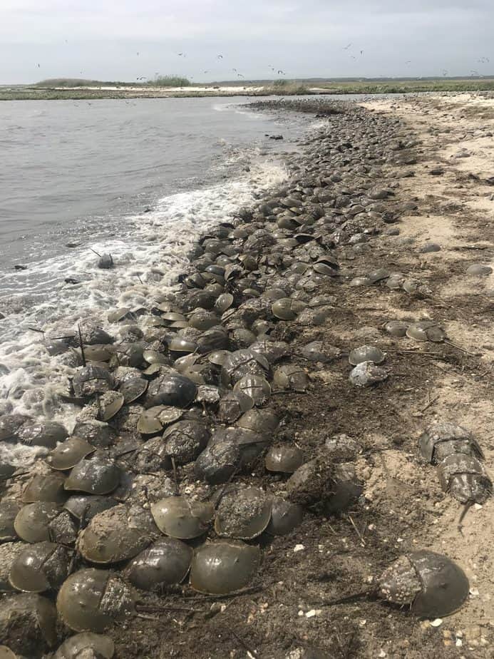 The crabs can lay eggs on Bayshore beaches and marsh in unimaginable densities. In 1986 horseshoe crabs would bury over 200,000 eggs in every square meter of beach. At those densities, beaches fill up, and eggs spill onto the surface and into the sea. Long windrows of horseshoe crab eggs create a natural spectacle of birds and fish devouring eggs just as they commence laying eggs themselves.