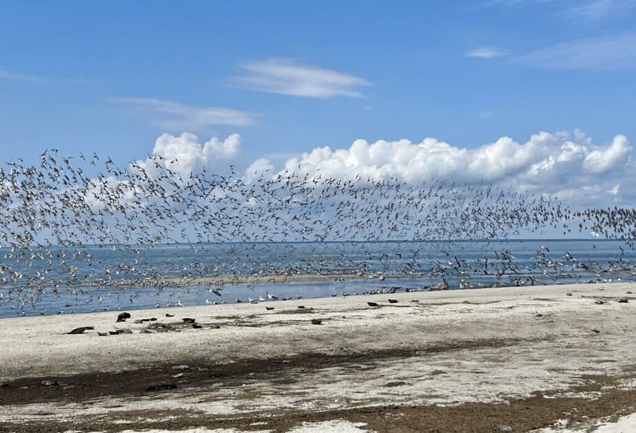 1700 red knots flying over cooks creek inlet nj. Photo by Charles Duncan