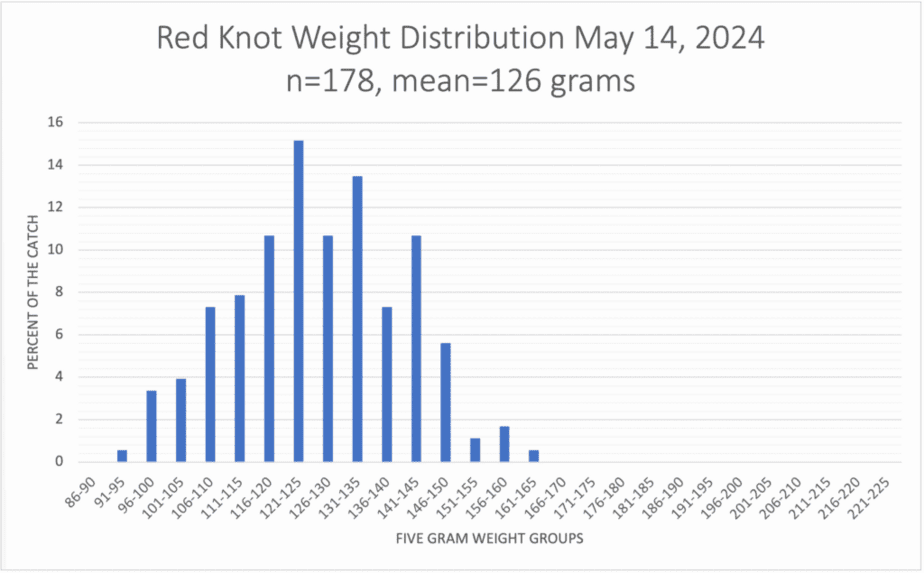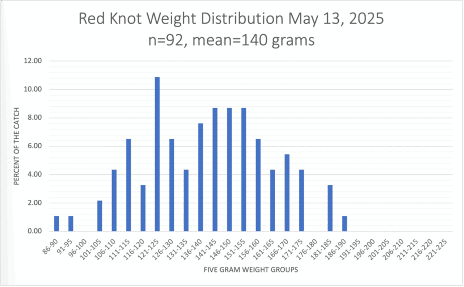 We made our first catch on May 13, the first day of our fieldwork.  Even though we were blessed with thousands of red knots, the catch wasn’t easy. We were faced with an abundance of riches: where should we set the net when we could set it in many different places? After a shift in location and many frustrations, we caught 94 knots. The weight distribution seen on the chart created by Stephanie showed a wide range of weights, probably the widest in our 28 years. One poor soul measured only 84 grams, a deadly weight for knots, so she was lucky to reach the bay and its bounty of eggs. In the same catch we caught birds that weighed a hefty 194 grams, a number we rarely see anymore, especially not at the beginning of the season. It’s a puzzle we will solve by the end of this season.